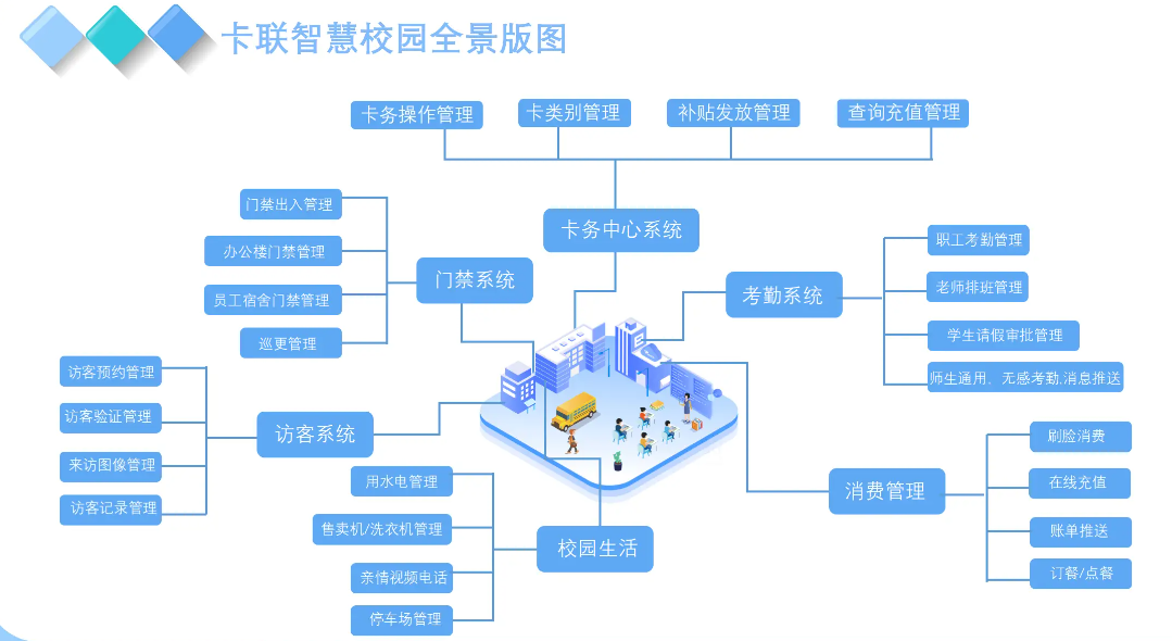 本次设计园区集中式一卡通管理平台,统一由园区公共服务部门管理。并对每个学校设置权限,学校之间互相独立,可单独管理本校的门禁、考勤系统,同时又能够在公共区域实现园区一卡通。